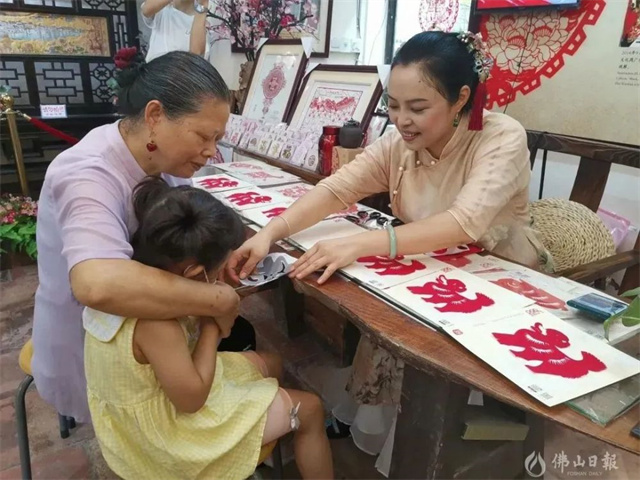 南風古灶旅游區進駐了饒寶蓮等一批非遺傳承人工作室。圖為佛山剪紙非遺傳承人饒寶蓮正在教小朋友做剪紙。