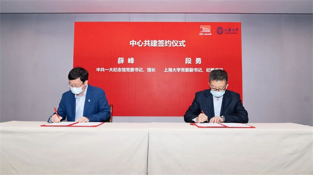 中共一大紀(jì)念館黨委書記、館長(zhǎng)薛峰與上海大學(xué)黨委副書記、紀(jì)委書記段勇簽署共建革命文物協(xié)同研究中心協(xié)議。雙方將聚焦革命文物保護(hù)、闡釋、利用與傳播等發(fā)展方向,開展全面合作。